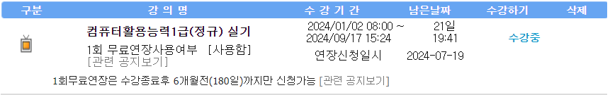 유동균쌤 강의는 수강종료 후 180일 전까지 1회 무료 연장을 신청할 수 있다.