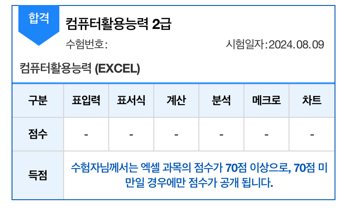 2024.08.26 - [자격증(Certificate)] - 컴퓨터활용능력 1급 필기 합격 후기